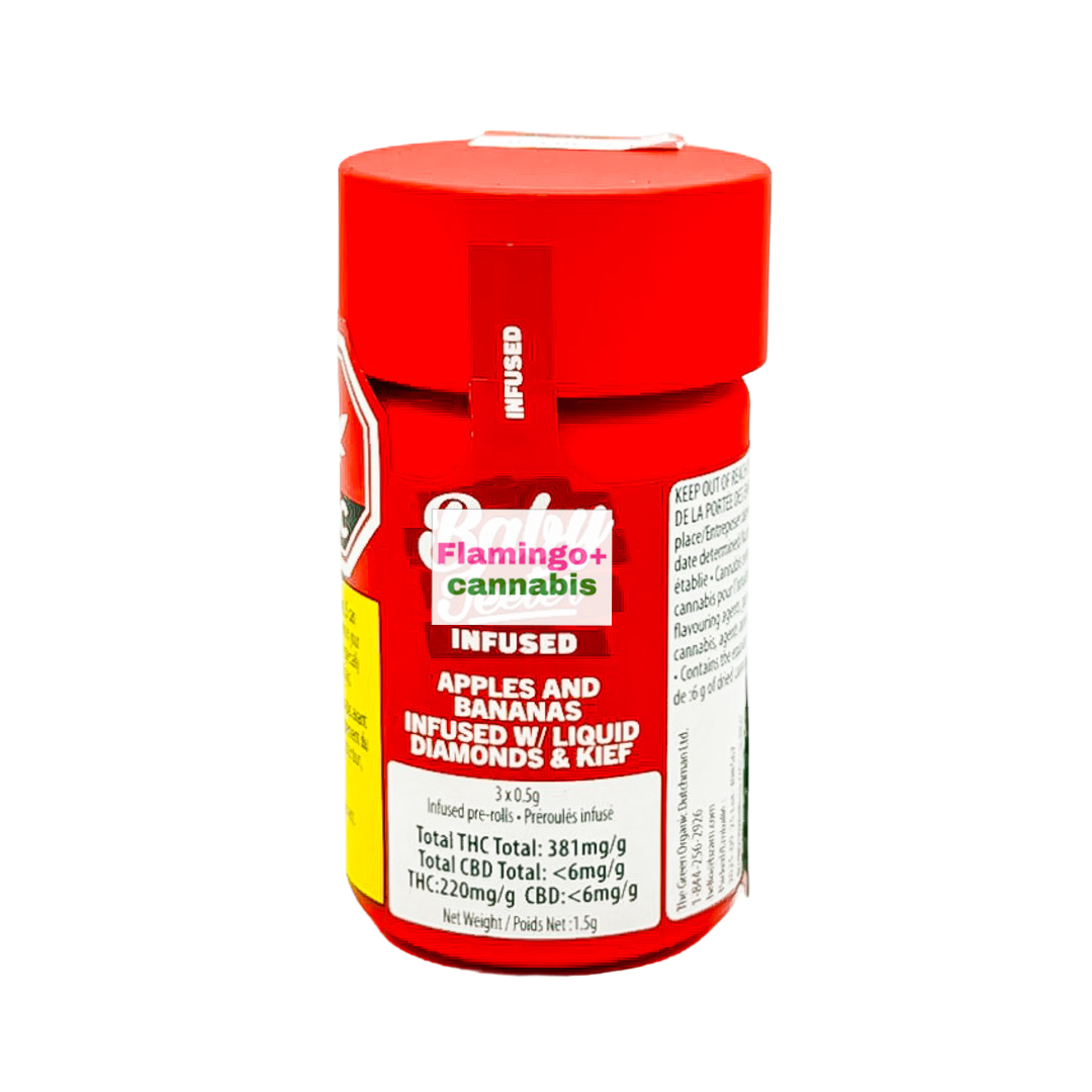 Baby Jeeter Apples & Bananas Infused Hybrid Pre-Roll 3X0.5G is here to prove that fruit salad absolutely can get you lifted — and no, you don’t need to pretend it’s healthy. This infused 3-pack takes the classic Apples & Bananas profile and cranks it into full Jeeter territory: bigger flavour, smoother pulls, and that unmistakable kief-coated swagger.