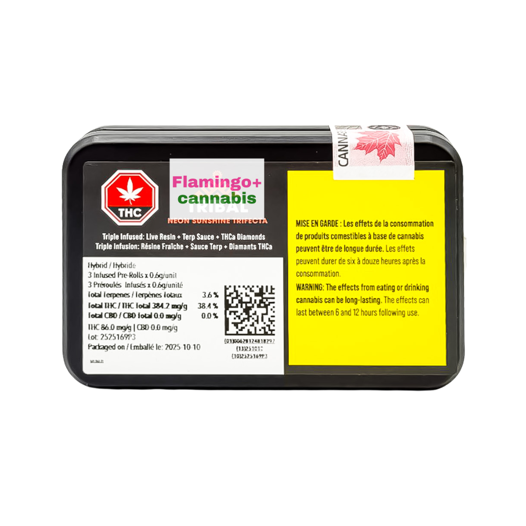 Grab Tribal Neon Sunshine Trifecta Infused Hybrid Pre-Rolls 3x0.6g today at Flamingo Plus Calgary — Alberta’s favourite destination for top-tier infused pre-rolls and unbeatable prices.